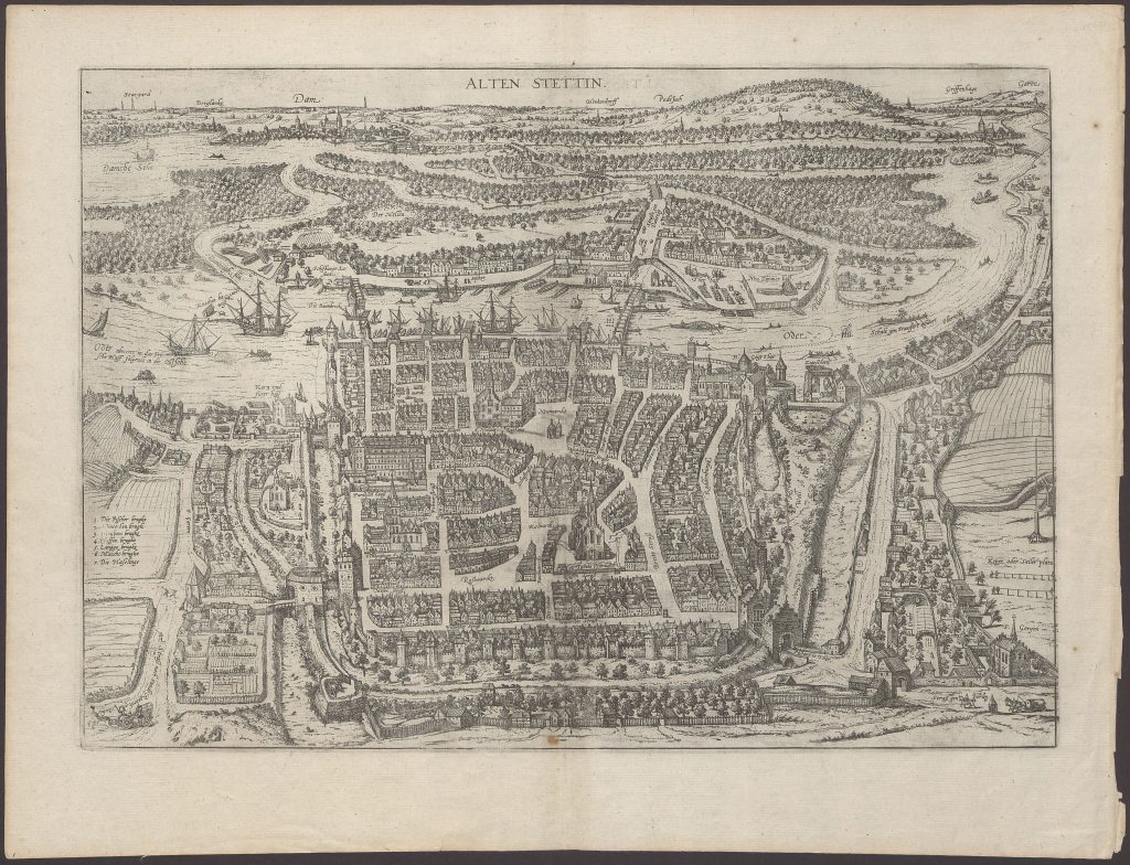 Ryc. 1 – Widok Szczecina z lotu ptaka, tzw. Brauna/Hogenberga, ok. 1600 (zbiory Biblioteki Głównej US, Ikn. 149)